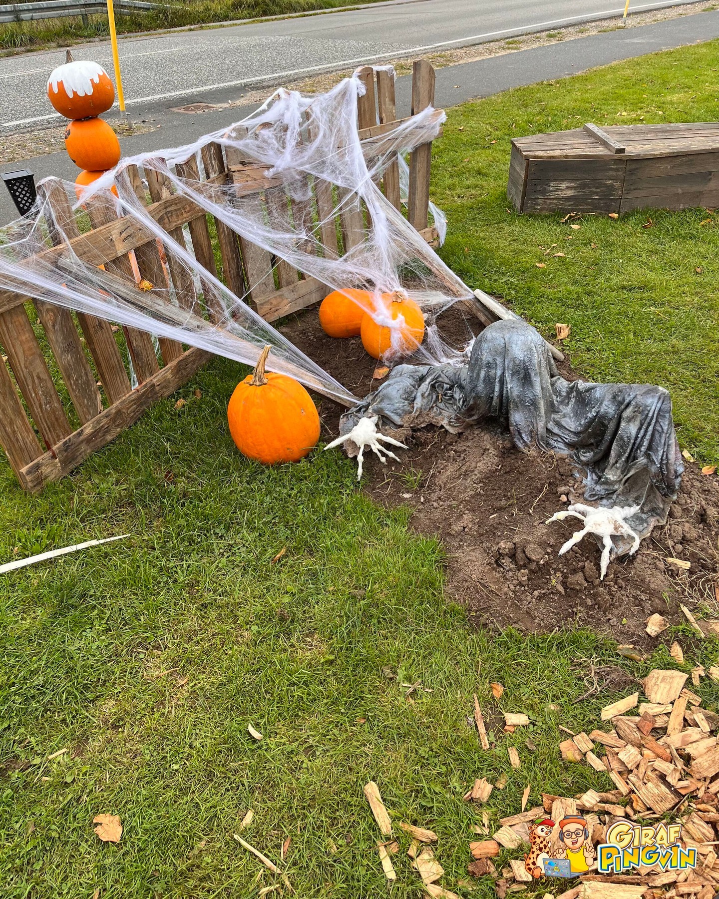• #Halloween med udskårne græskar og uhyggelig dekoration.