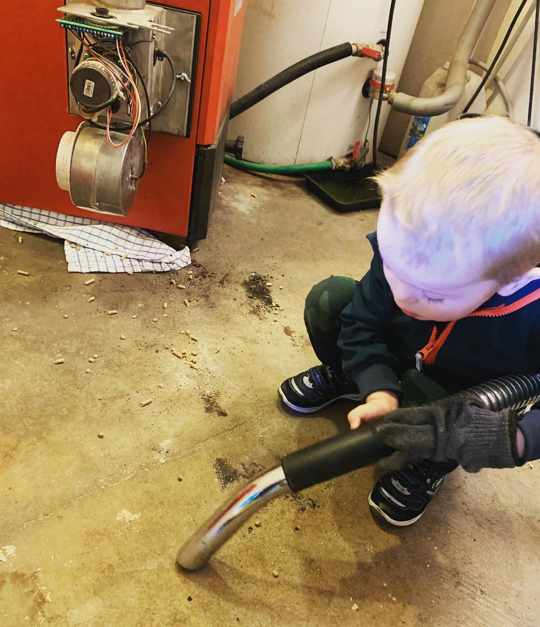 Det er skønt med en lille hjælper i fyrrummet, når vi skiller pillefyret ad for at skifte fotosensor 👶🏻🔥😘