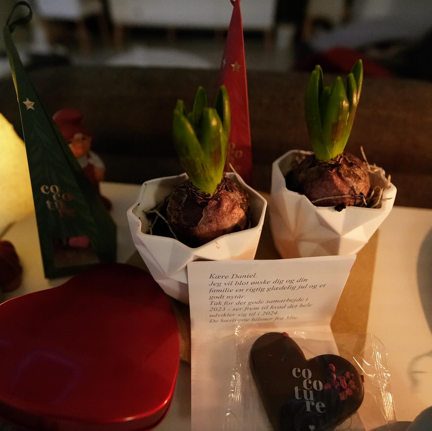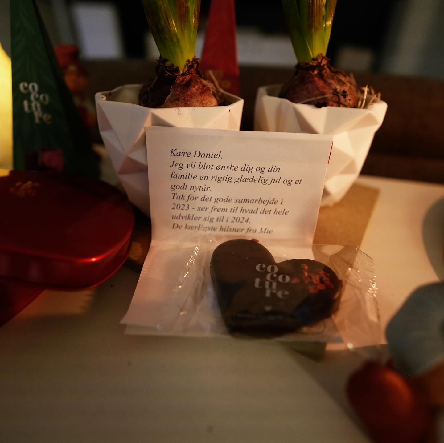 Tusinde tak for overraskelsen - for blomsterne 🌸 og chokoladen 🍫 (som jeg muligvis allerede har snuppet et par stykker af... shh, det er vores hemmelighed! 🤫) og for al din visdom, jeg har suget til mig i år 🧠