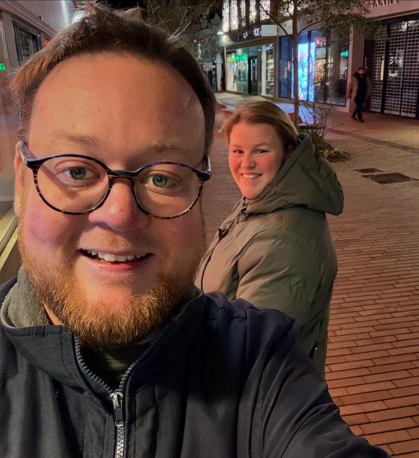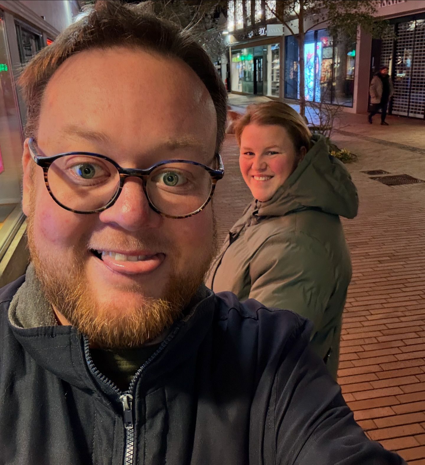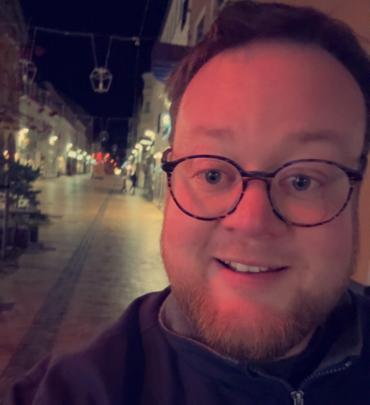Photo by girafpingvin (Daniel Bahl)🦒️🐧️ on November 16, 2024. May be a selfie of 1 person, beard, street and night.