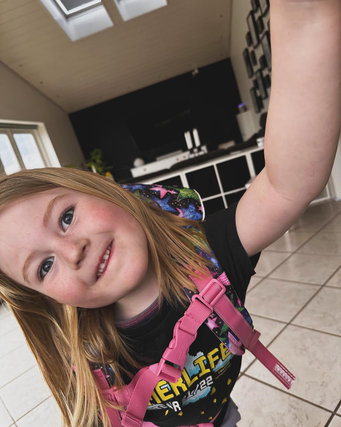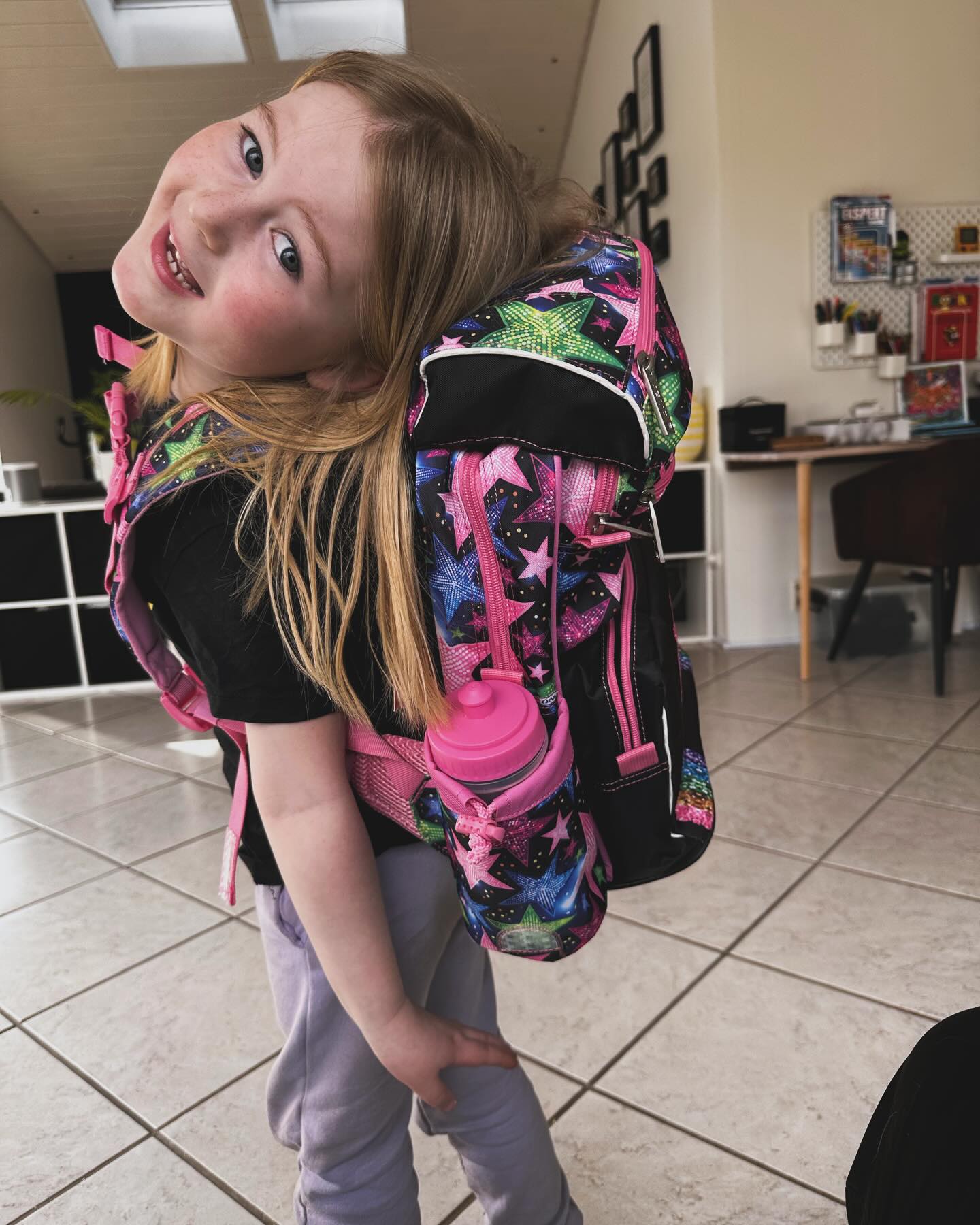Vi brugte dagen på at finde den perfekte skoletaske til Tilde. Hun forelskede sig totalt i en lækker JEVA taske, der kostede 1399 kr. i butikken.