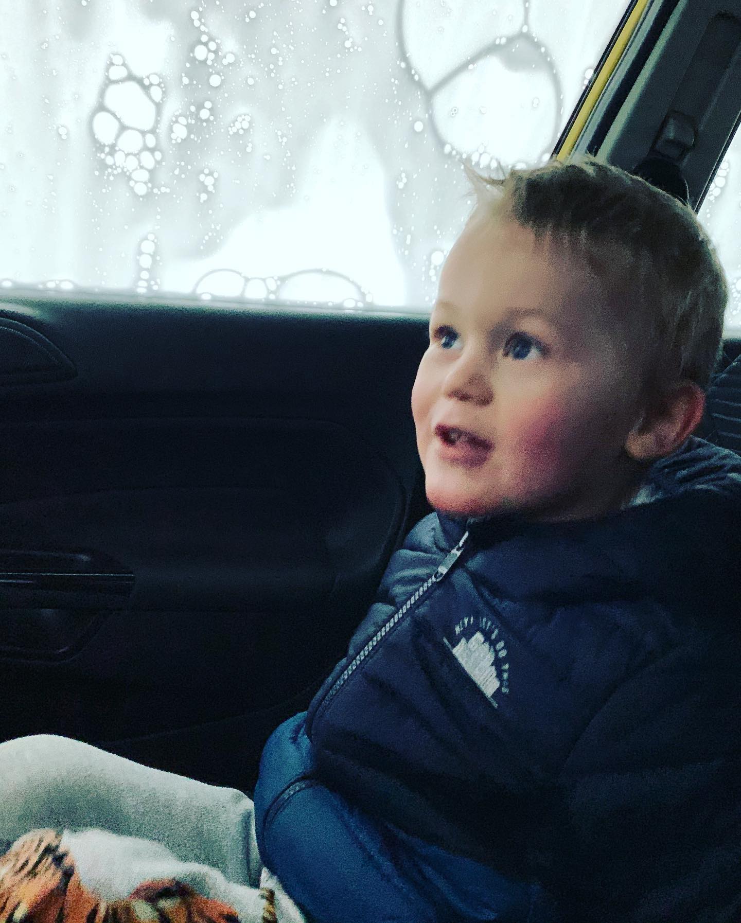 Magnus og jeg besluttede os for at tage en tur i bilvasken for at give bilen en tiltrængt forfriskning. Det var en sjov oplevelse, både for ham og mig. Magnus synes, det er fascinerende at se vandet og sæben danse rundt på ruderne.