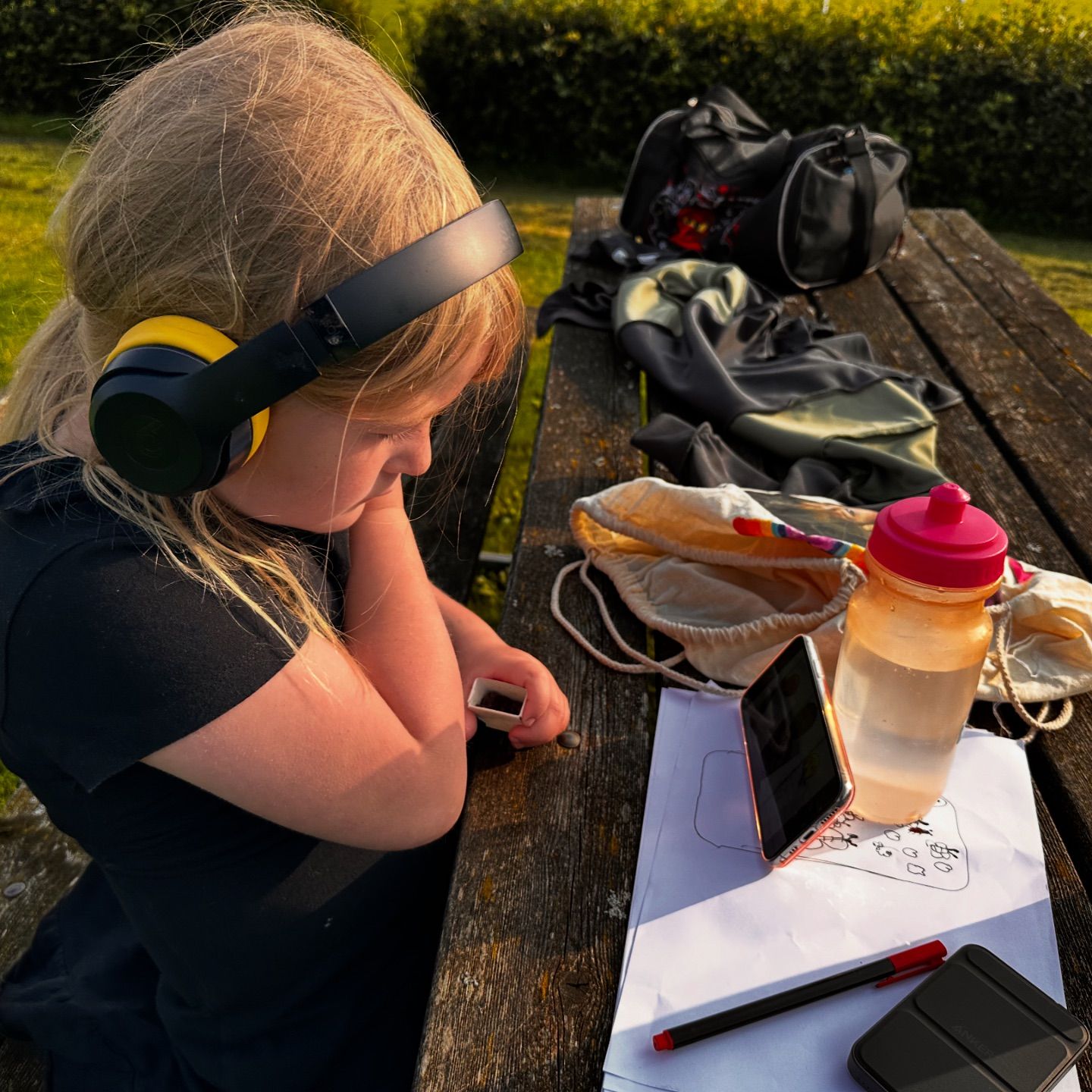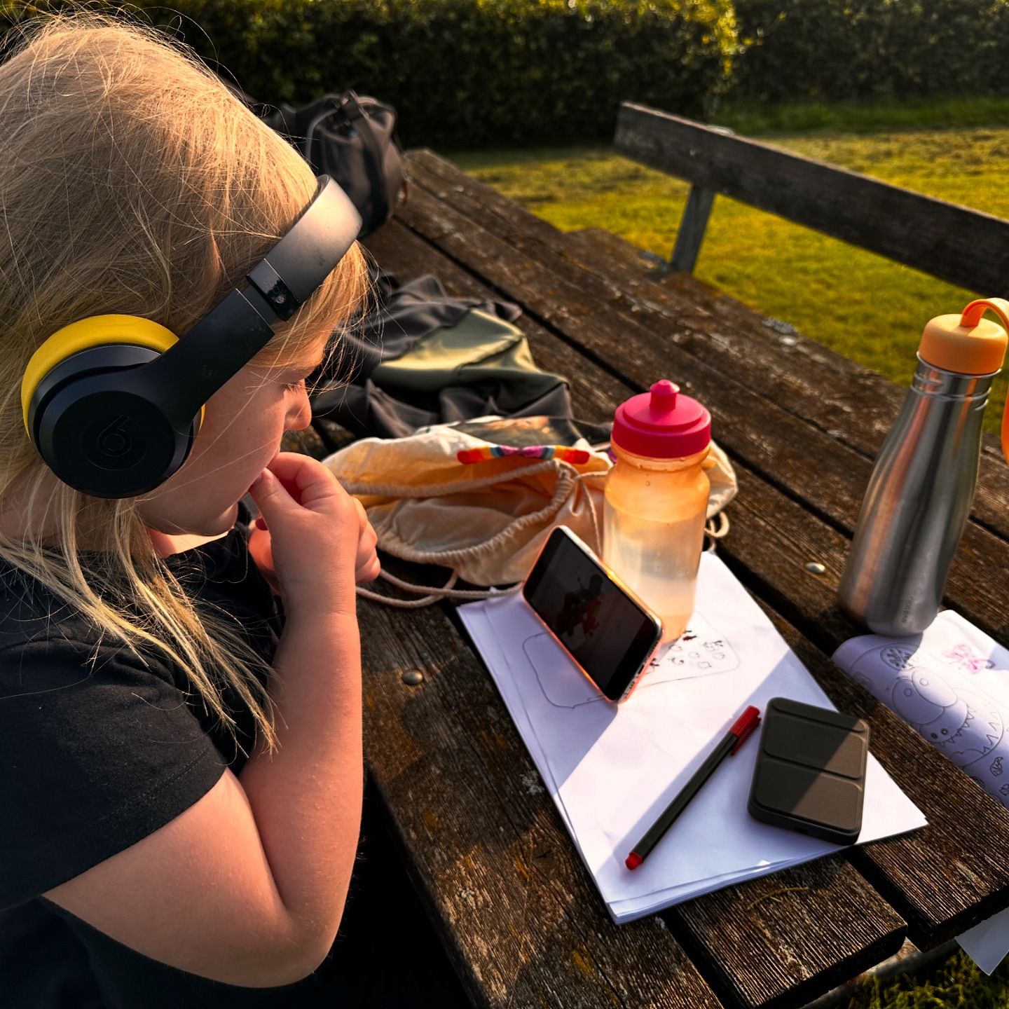 Tilde er også med på sidelinjen, men hun har skiftet fodboldstøvlerne ud med farveblyanter og musik i ørerne. 🎨🎧👑 Elsker når hun fordyber sig i kreative ting! 🤪🎵 ehh altså lige pånær græs😂😂🤪