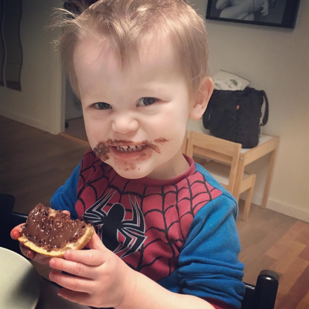 Det er ikke kun voksne, der elsker Nutella; børnene er lige så vilde med det. Bare spørg vores lille spiderman, der fejrer livet som toårig med et episk chokoladeoverskæg!