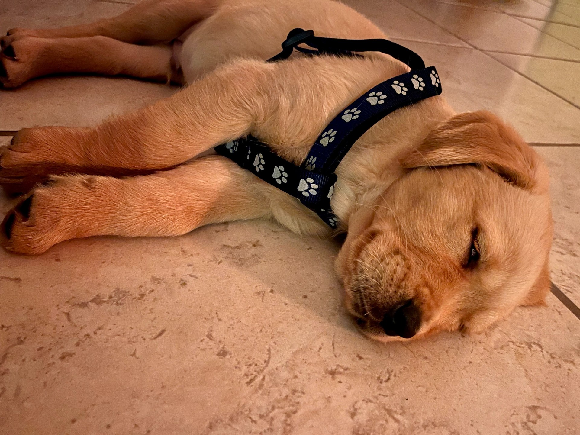 Det er fantastisk at se, hvor meget glæde og træthed en dag i sneen kan bringe. At se Bahloo ligge og sove på gulvet viser, hvor meget han har nydt dagen.