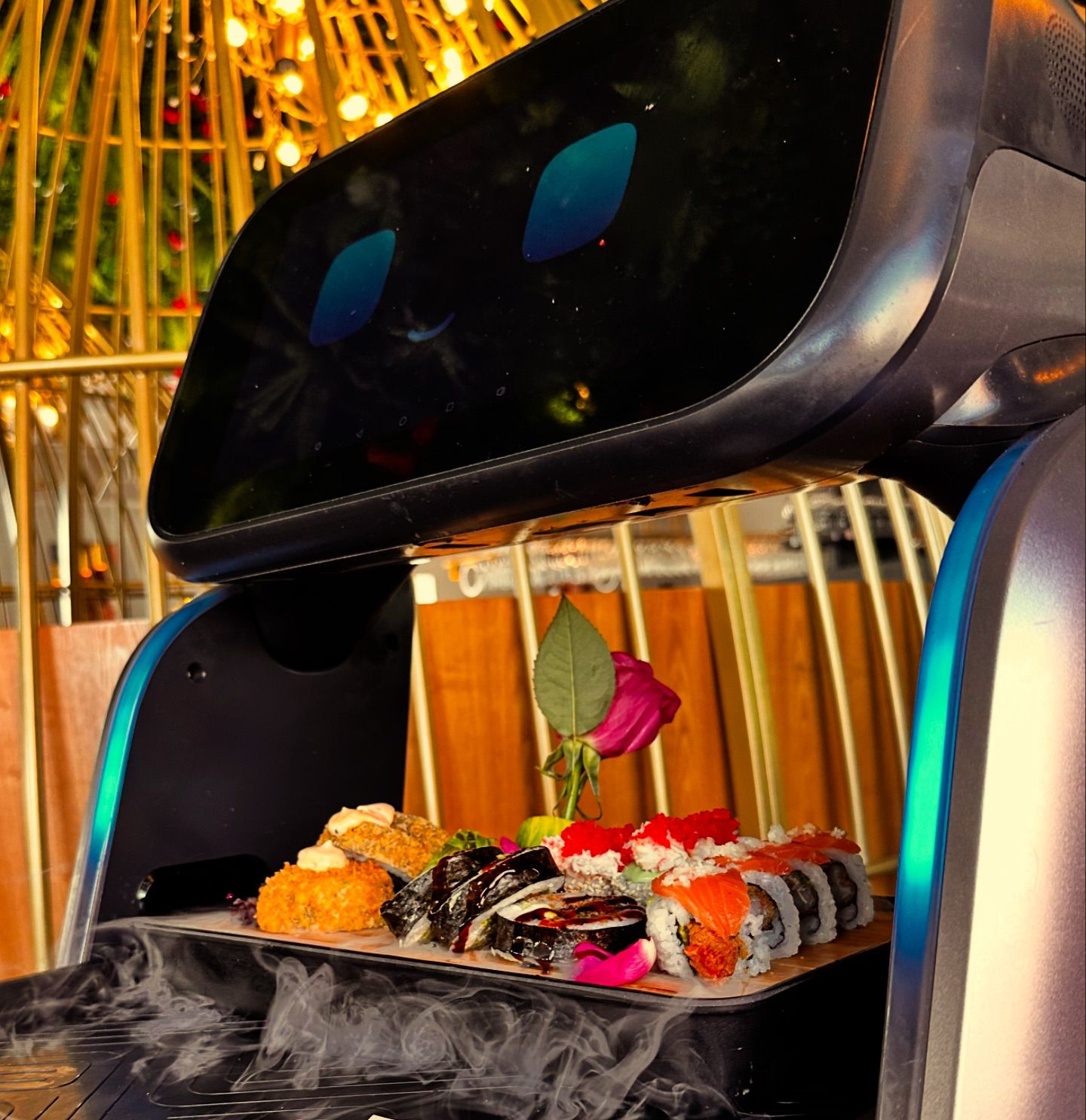 Nu er vi ude og spise sushi med en sød robot der kommer med maden 🍣🍤
